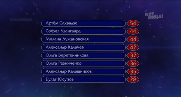 Артем Сахвадзе из Краснодарского края и Милана Лужановская из Иваново не допускали ошибок при ответах и не оставили шансов другим участникам. В итоговом раунде школьник с юга России обыграл представительницу «города невест» и унес с собой 698 тысяч рублей.