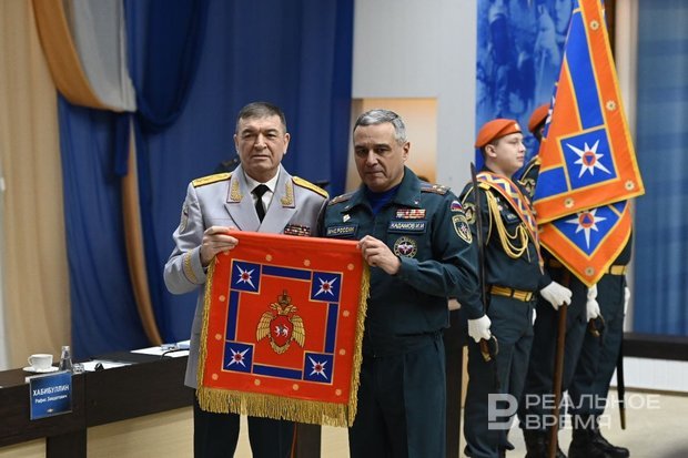 После исполнения государственного гимна Татарстана, и.о. начальника ГУ МЧС России по Татарстану Ирек Кадамов вручил Рафису Хабибуллину памятный штандарт — копию Знамени ГУ МЧС России.