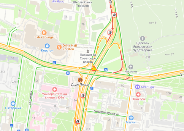 Сильные пробки наблюдаются также на пр. Универсиады, Вознесенском тракте, ул. Рихарда Зорге, Юлиуса Фучика, Хусаина Мавлютова, Танковой, Даурской, Аделя Кутуя, Николая Ершова и Вишневского. В центре города сильнее всего движение затруднено на ул. Габдуллы Тукая и Нурсултана Назарбаева.