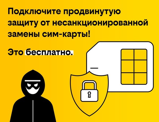 Мобильный оператор предлагает своим клиентам подключить дополнительную защиту от несанкционированной замены SIM. Это бесплатно. Такая защита поможет избежать риска взлома банковских приложений, соцсетей и мессенджеров.