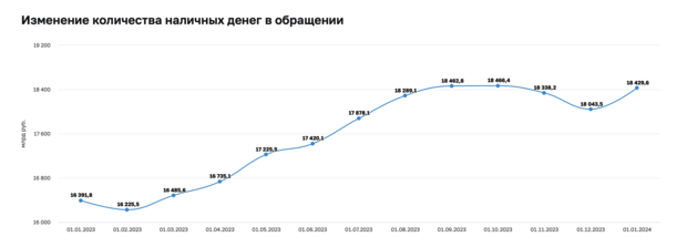 Согласно представленным данным, объем наличности у россиян начал расти в феврале 2023 года. На 1 января общая сумма составляла 16,4 триллиона, за месяц она снизилась до 16,2 трлн, но уже к 1 марта выросла до 16,49 трлн рублей. Далее рост продолжился, и уже в августе объем наличных средств превысил отметку в 18 трлн.