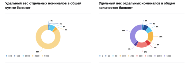 Приоритет россияне отдают купюрам и монетам крупного номинала. Среди бумажных денег 59% составляют купюры номиналом 1000, 2000 и 5000 рублей от общего количества банкнот. Причем пятитысячные составляют 38% от общего числа. Всего в обращении находится 80,4 млн единиц бумажных денег.