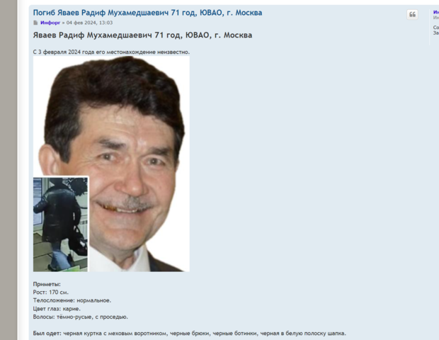 В воскресенье в поисковом отряде «ЛизаАлерт» появилось сообщение о том, что Радиф Яваев пропал в Москве, перестав выходить на связь с 3 февраля. В его поисках принимало участие несколько десятков волонтеров. В поисковом отряде также подтвердили гибель заслуженного работника культуры.