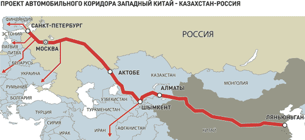 Отметим, что строительство автобана между Европой и Азией идет одновременно в нескольких странах: России, КНР и Казахстане. Летом 2014 года отмечалось, что в РФ ее строили фрагментарно. Маршрут проходит следующим образом: Санкт-Петербург — Москва — Нижний Новгород — Казань — Оренбург — Актобе — Кызылорда — Шымкент — Тараз — Кордай — Алматы — Хоргос — Урумчи — Ланьчжоу — Чжэнчжоу — Ляньюньган. Общая протяженность дороги – почти 8,5 тыс. км. Российский участок – самый короткий, 2,2 тыс. км. На Казахстан и Китай приходится 2,78 и 3,4 тыс. км соответственно.