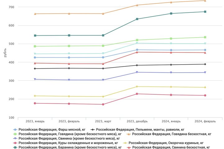 Средняя стоимость мяса, а именно бескостной говядины, выросла с 662 до 734 рублей за килограмм в период с января 2023 по январь 2024 года. Оно же является самым дорогим видом мяса из всего разнообразия, предложенного на рынке мясной продукции.