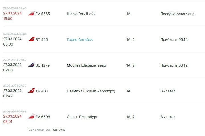 Также состоялись вылеты в Горно-Алтайск, Москву и Стамбул в период с 03.06 по 07.42 мск без задержек. С задержкой на 16 минут в 08.01 другой самолет вылетел в Санкт-Петербург. Вплоть до 08.45 мск серьезных задержек рейсов не было, кроме рейса в Шарм-Эль-Шейх авиакомпании «Россия».