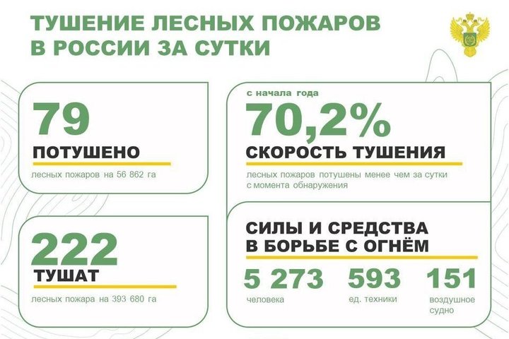 За прошедшие сутки в 23 российских регионах ликвидировали 79 очагов лесных возгораний. В то же время продолжается борьба с огнем в лесах 20 субъектов России, где зафиксировано 222 пожара.