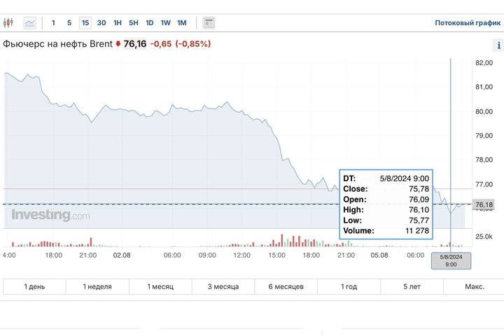 На лондонской бирже ICE цена на нефть марки Brent опустилась ниже $76 за баррель. Такое снижение произошло впервые с 9 января этого года.