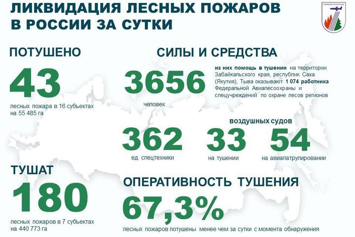 Однако работы по тушению продолжаются: сейчас специалисты борются со 180 очагами возгорания в семи регионах.