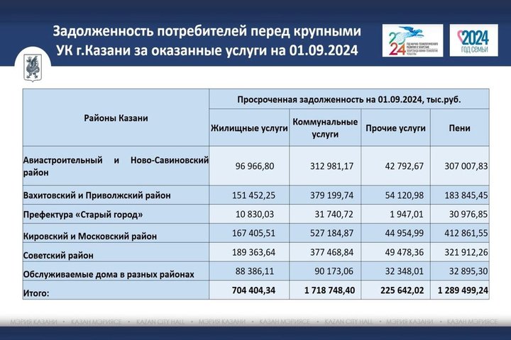 Задолженность жителей Казани перед коммунальщиками города по состоянию на 1 сентября 2024 года выросла до 3,93 млрд рублей. В прошлом году к аналогичной дате она составляла 3,9 млрд рублей.