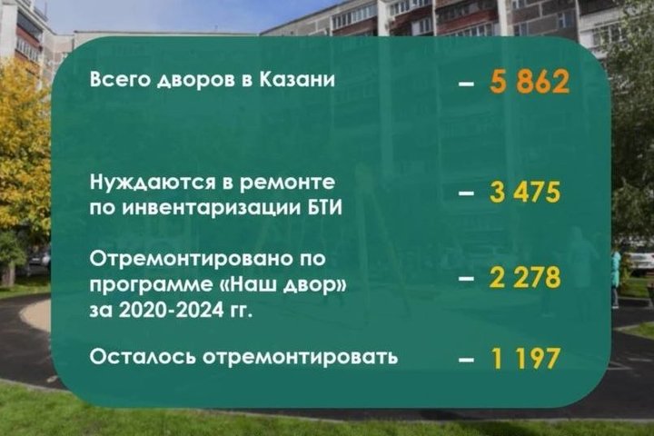 Напомним, в 2023 году в Казани на ремонт территорий многоквартирных домов по республиканской программе «Наш двор» потратили 2,8 млрд рублей — то есть на миллиард меньше, чем в 2024 году. Благоустройству подлежали дворы, на территории которых расположены 482 дома.