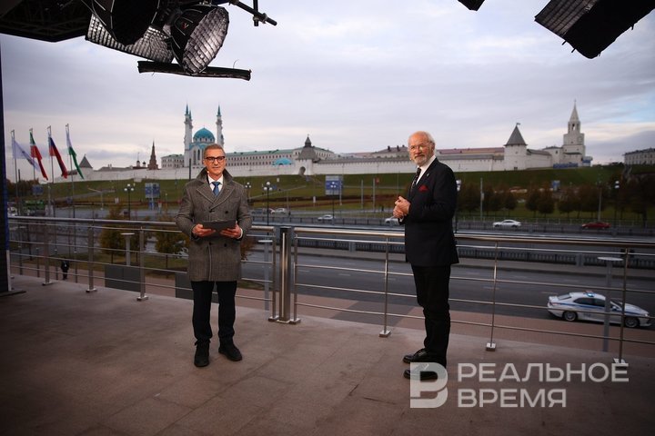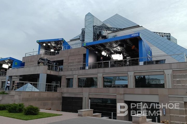 С потрясающим видом на Казанский Кремль и мечеть «Кул-Шариф» работают из казанской КРК «Пирамида» в прямом эфире сразу три студии Russia Today.