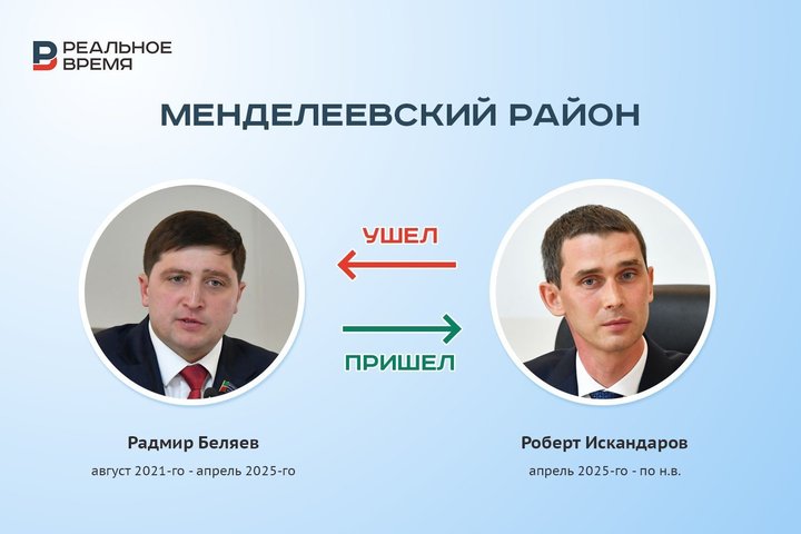 Вместо Беляева, которому за работу вручили медаль РТ «За доблестный труд», бразды правления в Менделеевском районе взял руководитель исполкома Роберт Искандаров. Он самый молодой среди всех новых глав — ему всего 33 года.