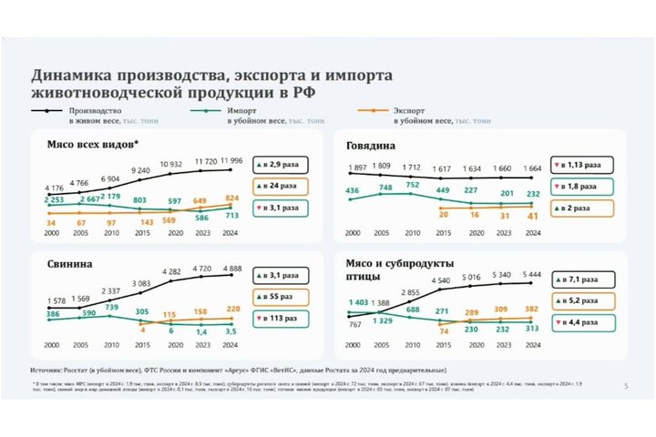 Руководитель Россельхознадзора Елена Цветкова связала отсутствие развития транспортного коридора с отставанием экспорта российской говядины. В то время как производство свинины и курятины в стране за последние годы выросло втрое, показатели по говядине остаются на прежнем уровне.