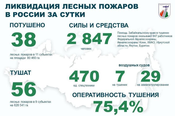 — Помощь Забайкальскому краю в тушении лесных пожаров оказывают 847 работников Федеральной Авиалесоохраны, Авиалесоохраны Коми, ХМАО, Иркутской области, Якутии, Бурятии, — добавили в пресс-службе Авиалесоохраны.
