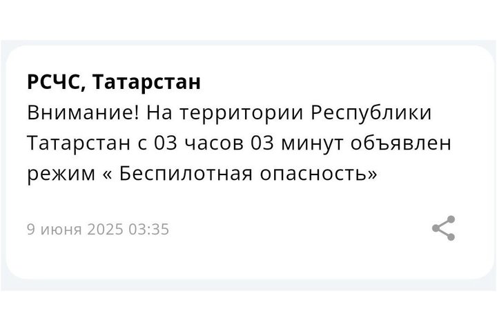 В Казани в 3.03 МЧС объявило об угрозе атаки беспилотных летательных аппаратов (БПЛА). Об этом сообщили в приложении ведомства.