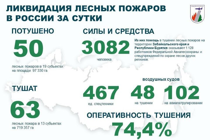 В борьбе с огнем задействовано значительное количество сил и средств: 3082 человека, 467 единиц техники и 48 воздушных судов. Авиационный мониторинг лесопожарной обстановки ведут 102 воздушных судна.