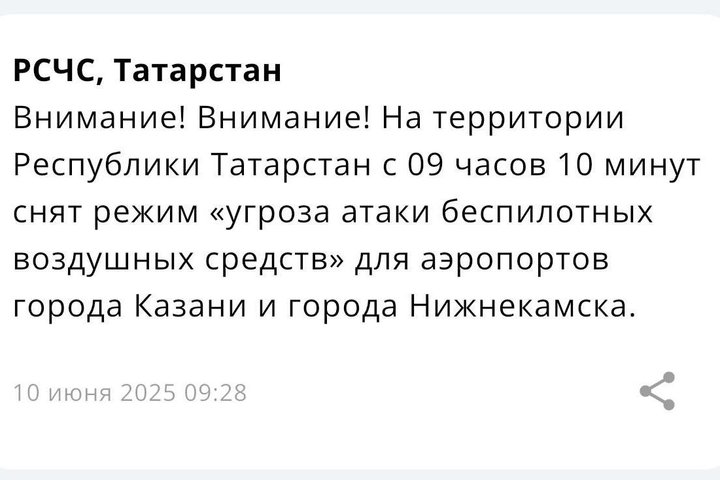 Ранее в Татарстане ввели режим «беспилотной опасности» из-за угрозы атак БПЛА. С 03.20 мск в республике и в аэропорту Казани объявлены временные ограничения на прием и выпуск самолетов для обеспечения безопасности полетов. Также режим «Угроза атаки БПЛА» был введен в аэропорту Нижнекамска с 04.10.
