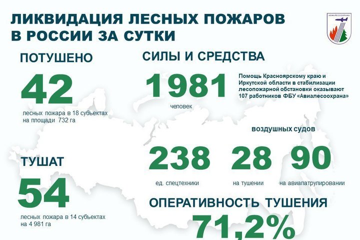В борьбе с огнем задействован 1 981 человек, 238 единиц техники и 28 воздушных судов. 90 воздушных судов осуществляют авиационный мониторинг лесопожарной обстановки.