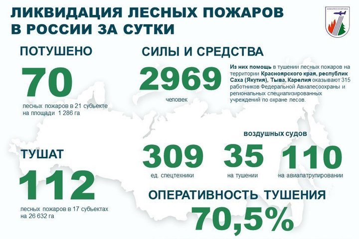 За прошедшие сутки в России было ликвидировано 70 лесных пожаров в 21 регионе страны. В настоящее время продолжаются работы по тушению 112 лесных пожаров в 17 регионах. В борьбе с огнем задействовано: