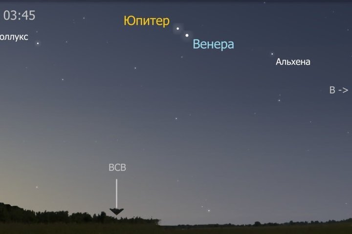 Сегодня ночью на звездном небе можно увидеть сближение Венеры и Юпитера. Это единственная ночь на ближайшие три года, когда две ярчайшие планеты окажутся на расстоянии менее 1 градуса друг от друга. Об этом пишет лаборатория солнечной астрономии ИКИ РАН.