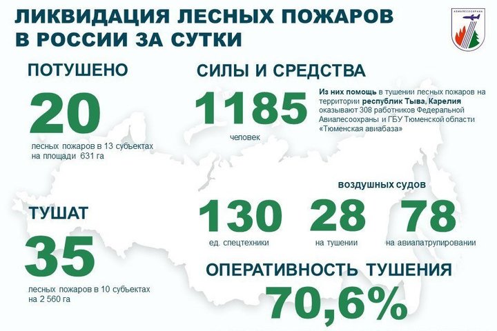 За прошедшие сутки в России ликвидировано 20 лесных пожаров в 13 регионах страны. В настоящее время продолжаются работы по тушению 35 лесных пожаров в 10 регионах. В борьбе с огнем задействовано 1 185 человек, 130 единиц техники и 28 воздушных судов.
