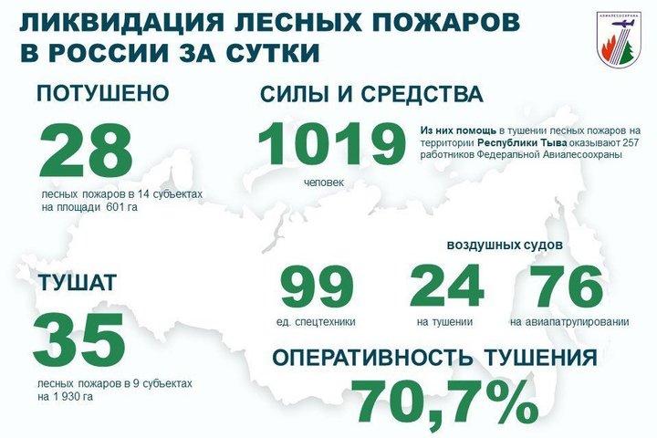 За прошедшие сутки в России ликвидировано 28 лесных пожаров в 14 регионах страны. В настоящее время продолжаются работы по тушению 35 лесных пожаров в девяти регионах. К борьбе с огнем привлечены 1 019 человек, 99 единиц техники и 24 воздушных судна.