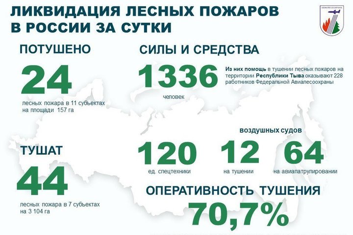 За прошедшие сутки в России ликвидировано 24 лесных пожара в 11 регионах страны. В настоящее время продолжаются работы по тушению 44 лесных пожаров в семи регионах.