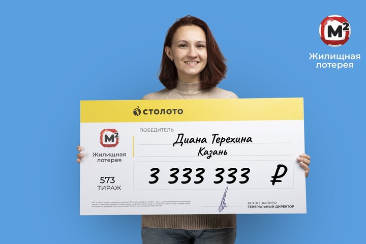 В 2024 году жительница Казани Диана Терехина в фирменном магазине «Столото» впервые купила три билета «Жилищной лотереи» и только спустя неделю после розыгрыша узнала, что по итогам 573-го тиража выиграла 3 333 333 рубля.