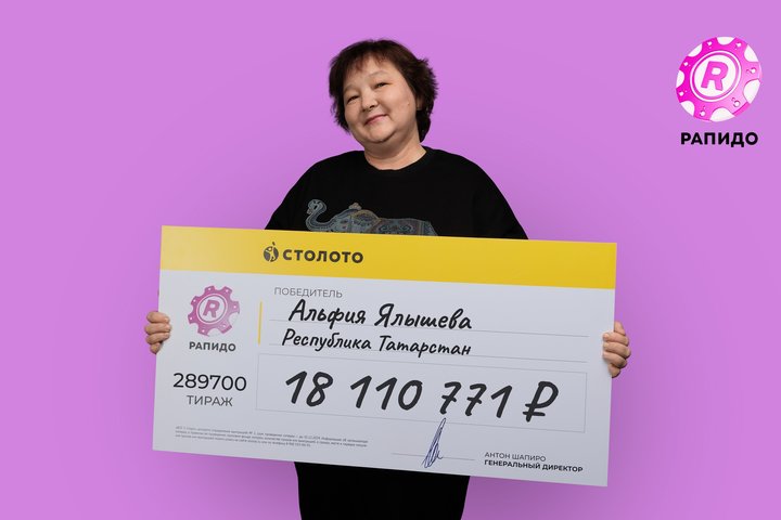 В 2023 году учитель английского языка и по совместительству завуч Альфия Ялышева из небольшого села Республики Татарстан купила в мобильном приложении «Столото» билет на 289700-й тираж лотереи «Рапидо»** и выиграла 18 110 771 рубль. В розыгрыше победную комбинацию чисел угадали сразу два участника, и суперприз размером 36 221 542 рубля поделился поровну. Крупно повезло не только Альфие, но и участнику из Московской области.