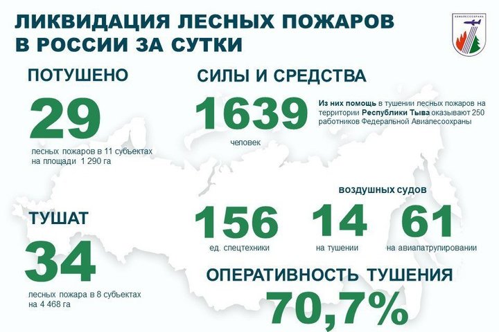 В борьбе с огнем задействованы 1 639 человек, 156 единиц техники и 14 воздушных судов. 61 воздушное судно осуществляет авиационный мониторинг лесопожарной обстановки.