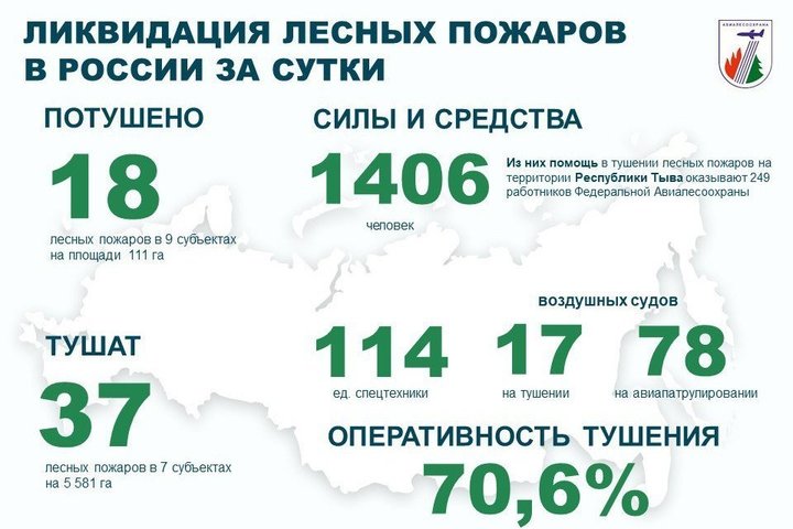 За прошедшие сутки в России ликвидированы 18 лесных пожаров на территории 9 регионов. В настоящее время продолжаются работы по тушению 37 лесных пожаров в 7 регионах страны.