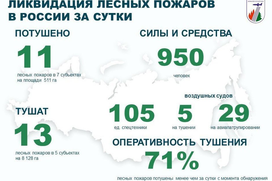 В ликвидации пожаров задействованы 950 человек, 105 единиц техники и пять воздушных судов. 29 воздушных судов проводят авиационный мониторинг лесопожарной обстановки.