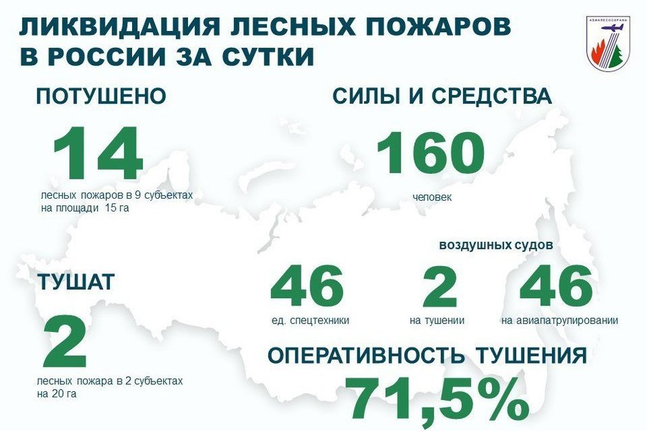 За прошедшие сутки на территории России было ликвидировано 14 лесных пожаров в девяти регионах страны. В настоящее время продолжаются работы по тушению двух лесных пожаров, зафиксированных в двух регионах.