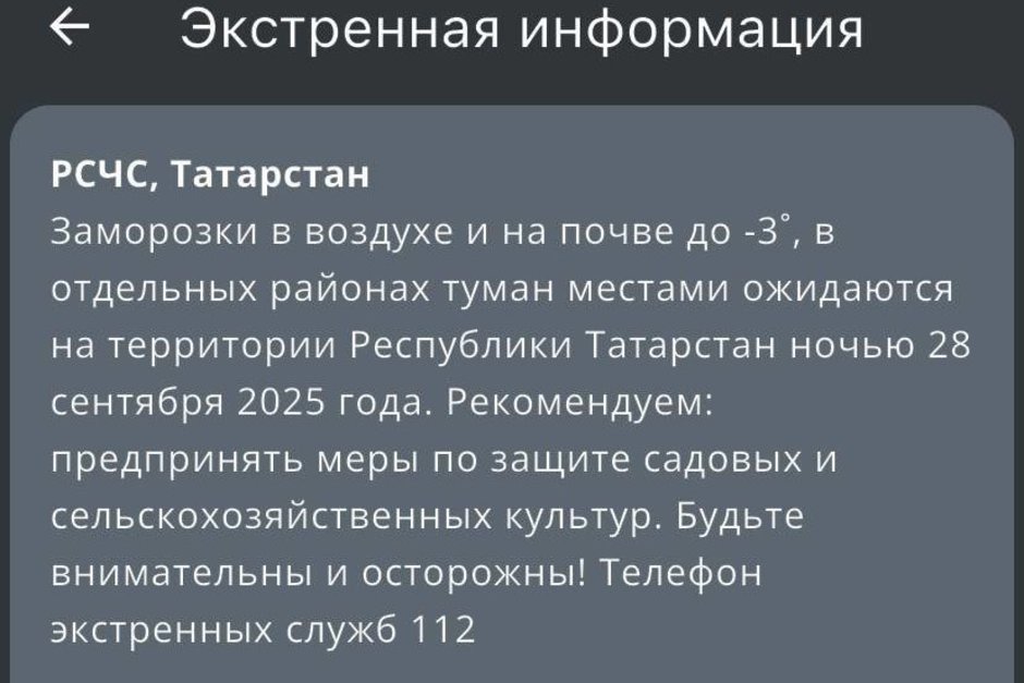 РСЧС Татарстана предупредила о заморозках в ночь на 28 сентября. Столбик термометра может опуститься до -3. Сообщение об этом появилось в приложении МЧС.