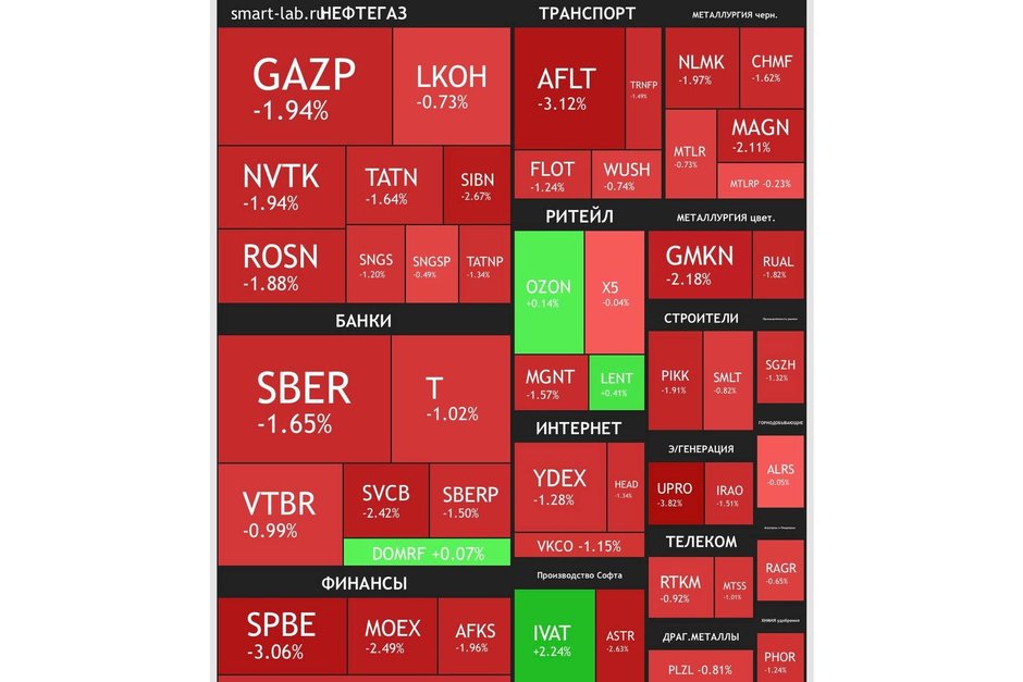 По данным торгов на Московской бирже, к 17:00 мск индексы Мосбиржи и РТС снижались на 0,76%, достигнув отметок 2 648,19 пункта и 1 061,45 пункта соответственно. Однако к 17:37 мск падение ускорилось: индекс Мосбиржи опустился до 2 609,75 пункта (-2,2%), а индекс РТС потерял 1,77%, составив 1 050,65 пункта.