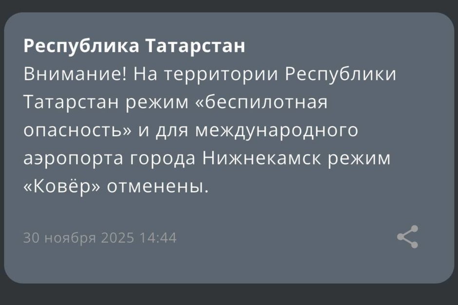 В Татарстане сняли режим беспилотной опасности. Об этом сообщили в МЧС.