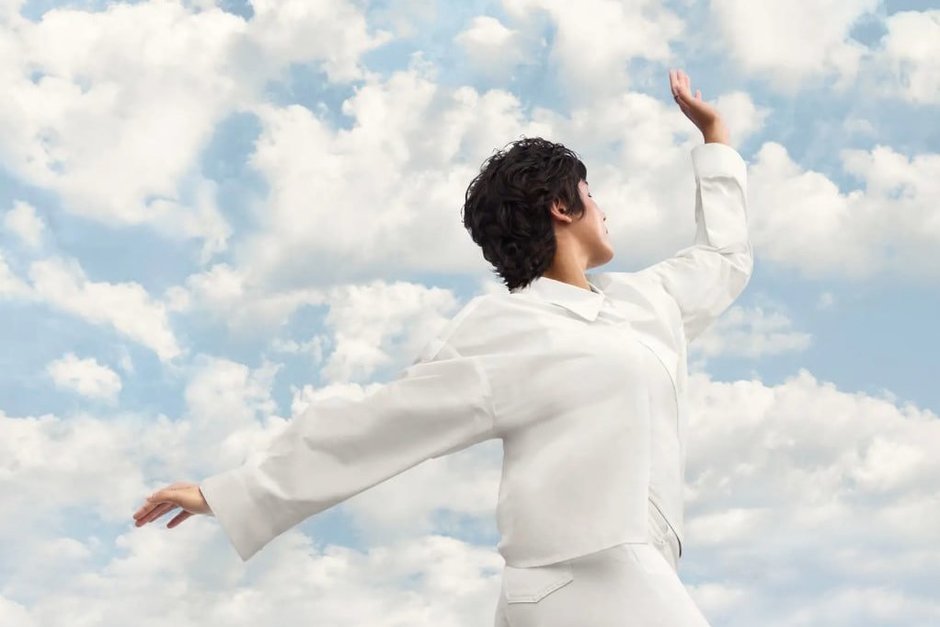 В презентации, представляющей «Облачную Танцовщицу» как цвет будущего года, изображена женщина в белом, мечтательно смотрящая в затянутое облаками небо, что подчеркивает ощущение безмятежности и чистоты, исходящее от этого оттенка.