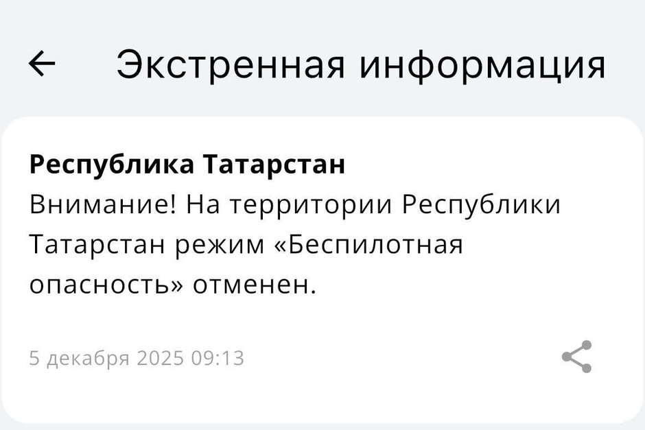 В Татарстане сняли режим «Беспилотная опасность». Он действовал больше семи часов: с 01:56 до 09:13 мск. Об этом сообщил в приложении МЧС.