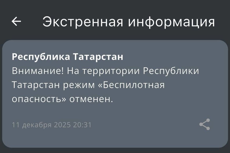 В Татарстане спустя полтора часа отменили режим беспилотной опасности. Об этом сообщили в МЧС. Ранее предупреждения повлияли на работу международного аэропорта Казани, который был временно закрыт для приема и выпуска воздушных судов.