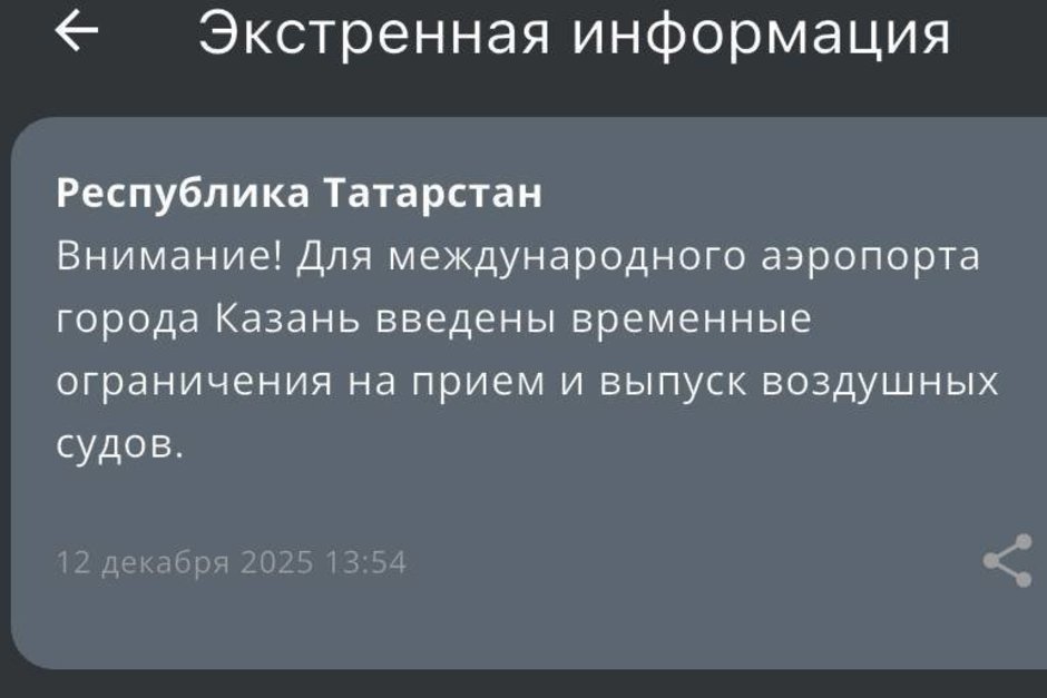 В Казани закрыли аэропорт на прием и выпуск воздушных судов. Об этом сообщают в МЧС. В 13:48 мск в республике был введен режим «Беспилотная опасность».