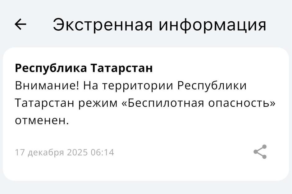 В Татарстане пять часов длился режим беспилотной опасности. В приложении МЧС сообщили, что с 06:14 он больше не действует.