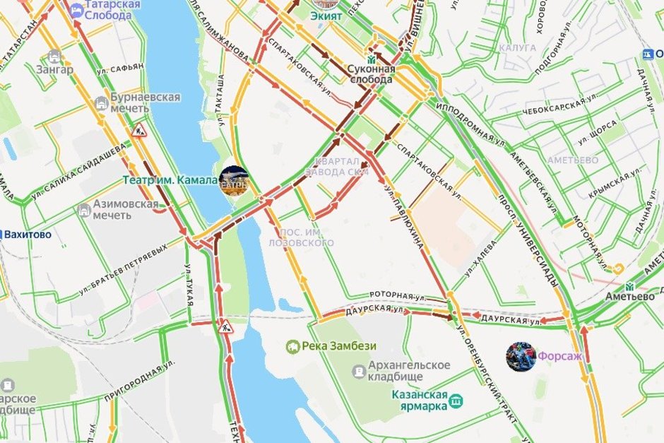 Тогда затруднения на дорогах наблюдались на выезде на Мамадышский тракт и на улице Вишневского. К этому присоединилась двухкилометровая пробка на мосту около «Казань Арены». Также пробка на 2,2 километра растянулась с улицы Технической до светофора на перекрестке Павлюхина — Назарбаева. В отличие от других дорожных ситуаций, эта не связана с ДТП. На участке, где образовалась пробка, идут ремонтные работы.