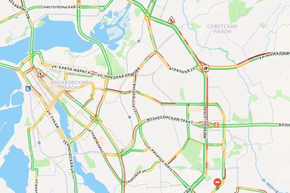 Наиболее напряженная ситуация отмечается в Вахитовском и Советском районах. Крупные заторы зафиксированы на улице Вишневского, Мамадышском тракте и проспекте Победы.