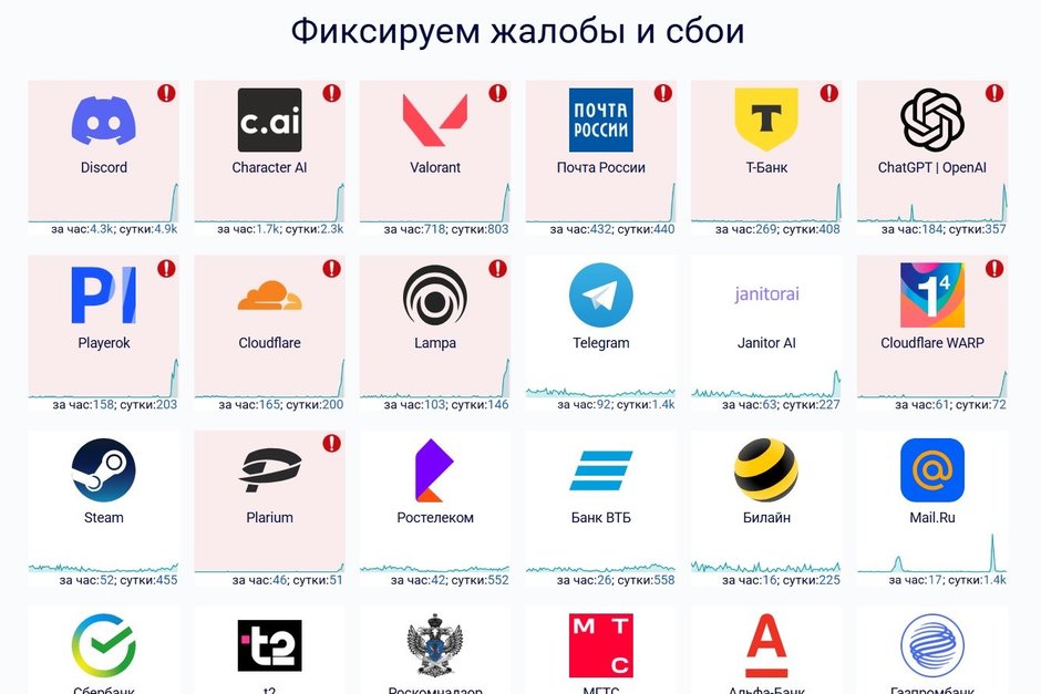 В Татарстане фиксируют сбои в Discord, Character Ai и сайта «Т-Банке». Это следует из данных сайта down404.ru.