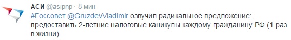 «#Госсовет @GruzdevVladimir озвучил радикальное предложение: предоставить 2-летние налоговые каникулы каждому гражданину РФ (1 раз в жизни)», — сообщает пресс-служба Агентства стратегических инициатив в «Твиттере».
