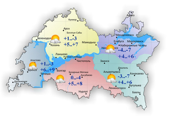 Днем максимальная температура воздуха достигнет 4—9 градусов выше ноля, сообщается на сайте Гидрометцентра РТ.