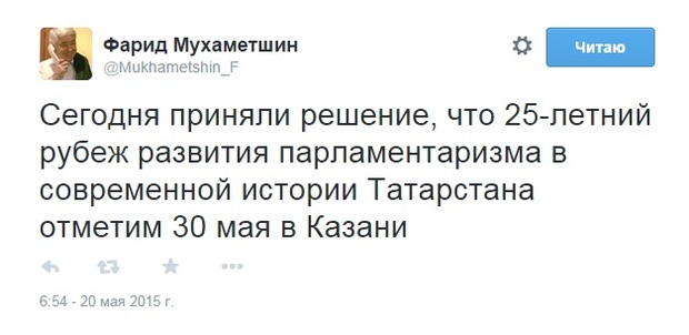 Праздник по случаю 25-летия парламентаризма в Татарстане пройдет в Казани 30 мая. Об этом в «Твиттере» написал председатель Госсовета РТ Фарид Мухаметшин.