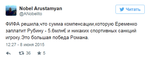 FIFA обязала игрока ЦСКА, бывшего полузащитника «Рубина» Романа Еременко выплатить казанской команде компенсацию в 5,6 млн евро.