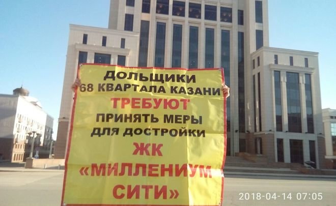 Сегодня дольщики ЖК «Миллениум Сити» вышли с пикетом к зданию кабинета министров РТ. Продолжать акцию у стен дома правительства активисты намерены до тех пор, пока стройку не возобновят.